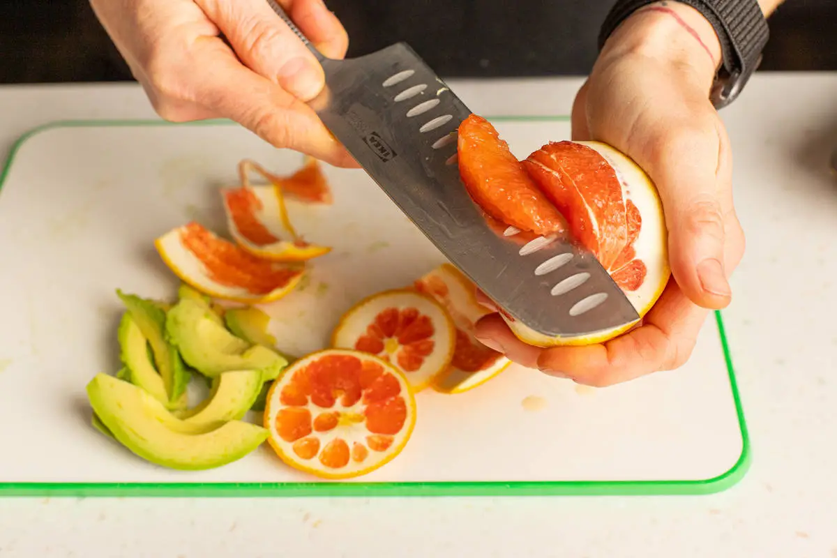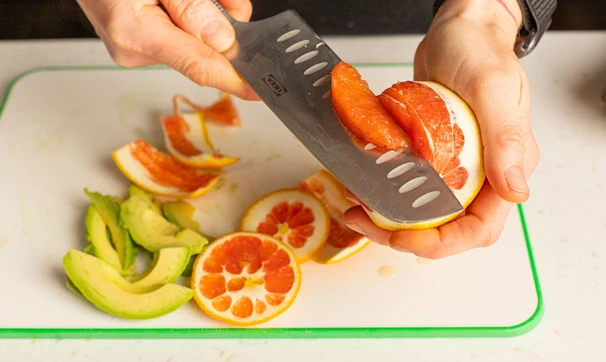 У апельсина срежьте кожуру ножом, вырежьте дольки «филе» без белой части.