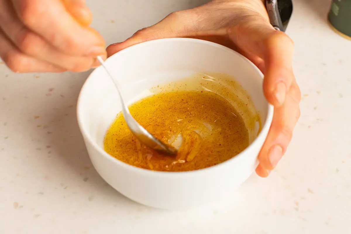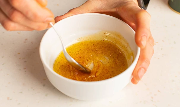 Смешайте оливковое масло с мёдом, паприкой, солью и капелькой лимонного или апельсинового сока. Половиной заправки полейте готовую киноа и перемешайте, добавьте мелко нарезанную петрушку.