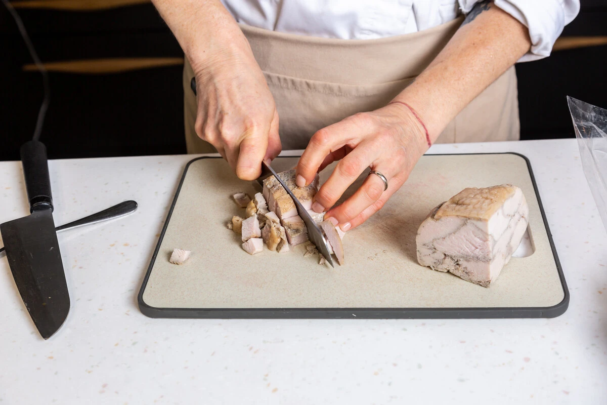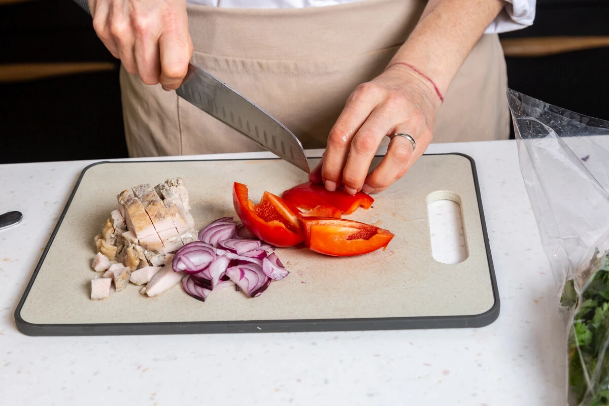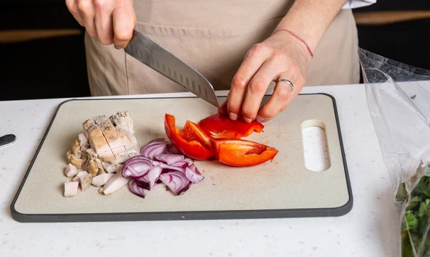 Красный лук нарежьте перьями, сладкий перец — кубиками.