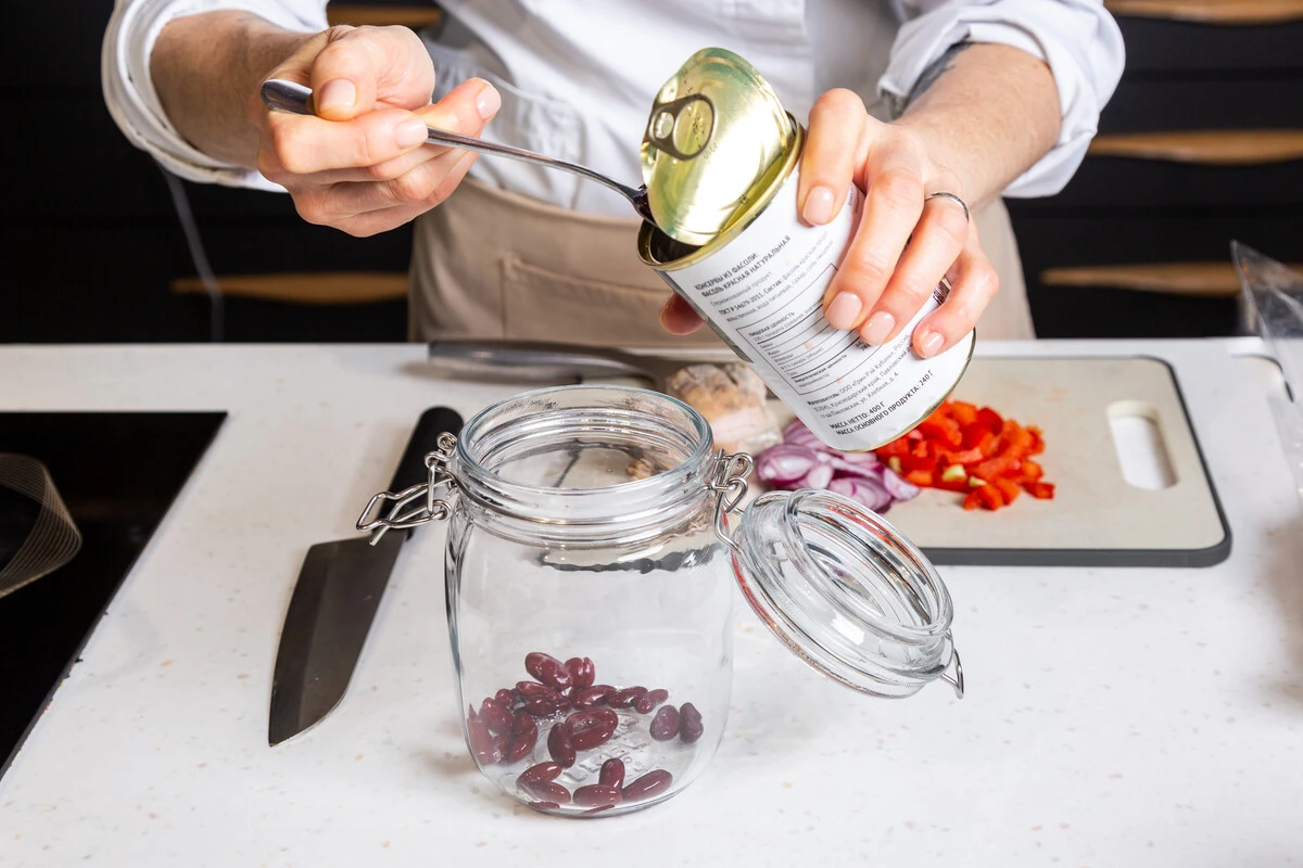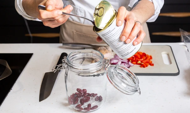 С фасоли слейте жидкость, выложите бобы первым слоем в банку.