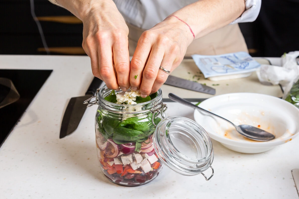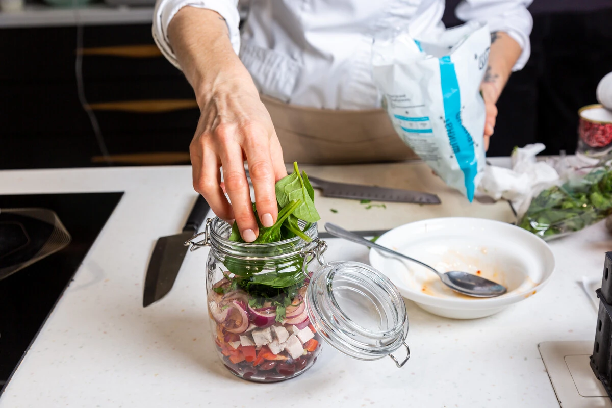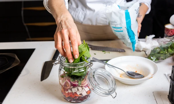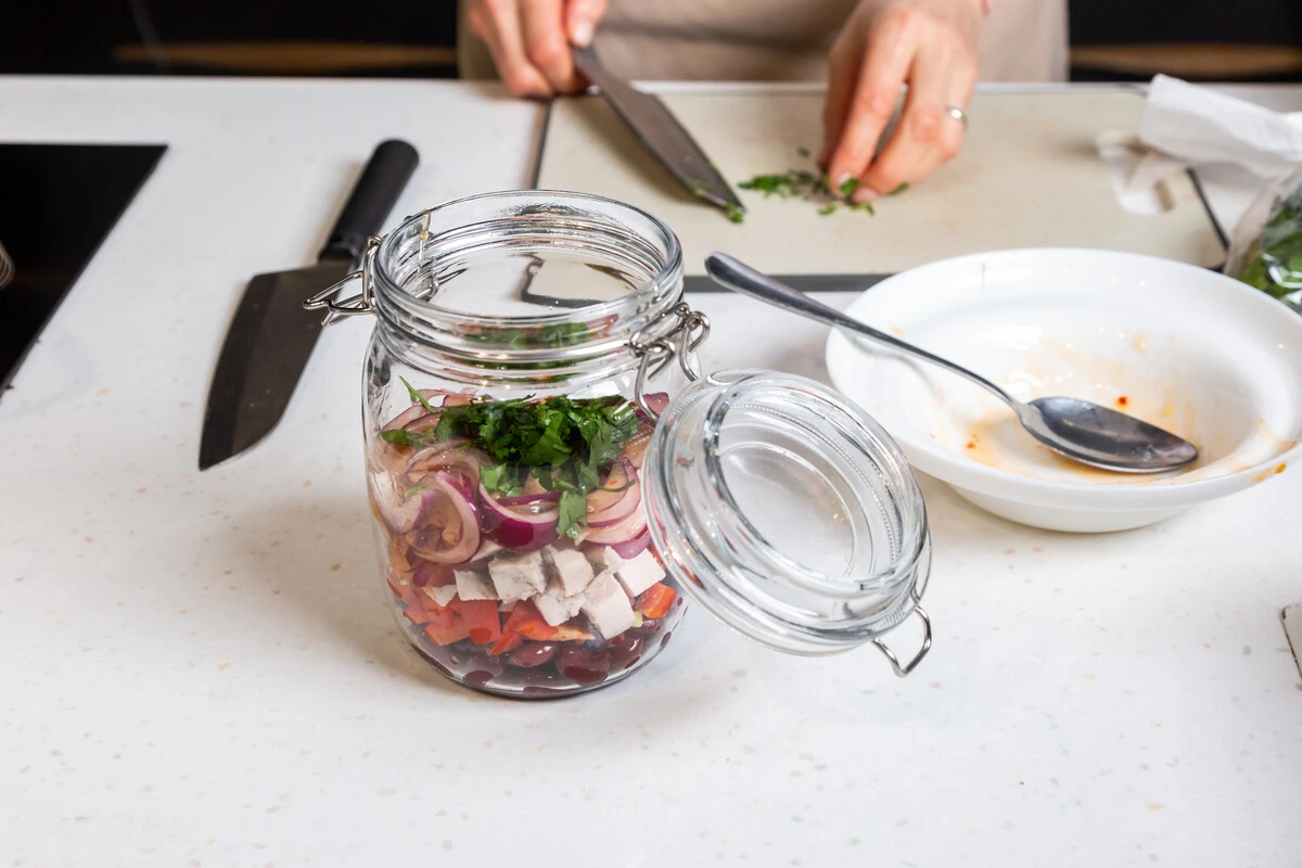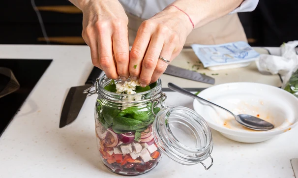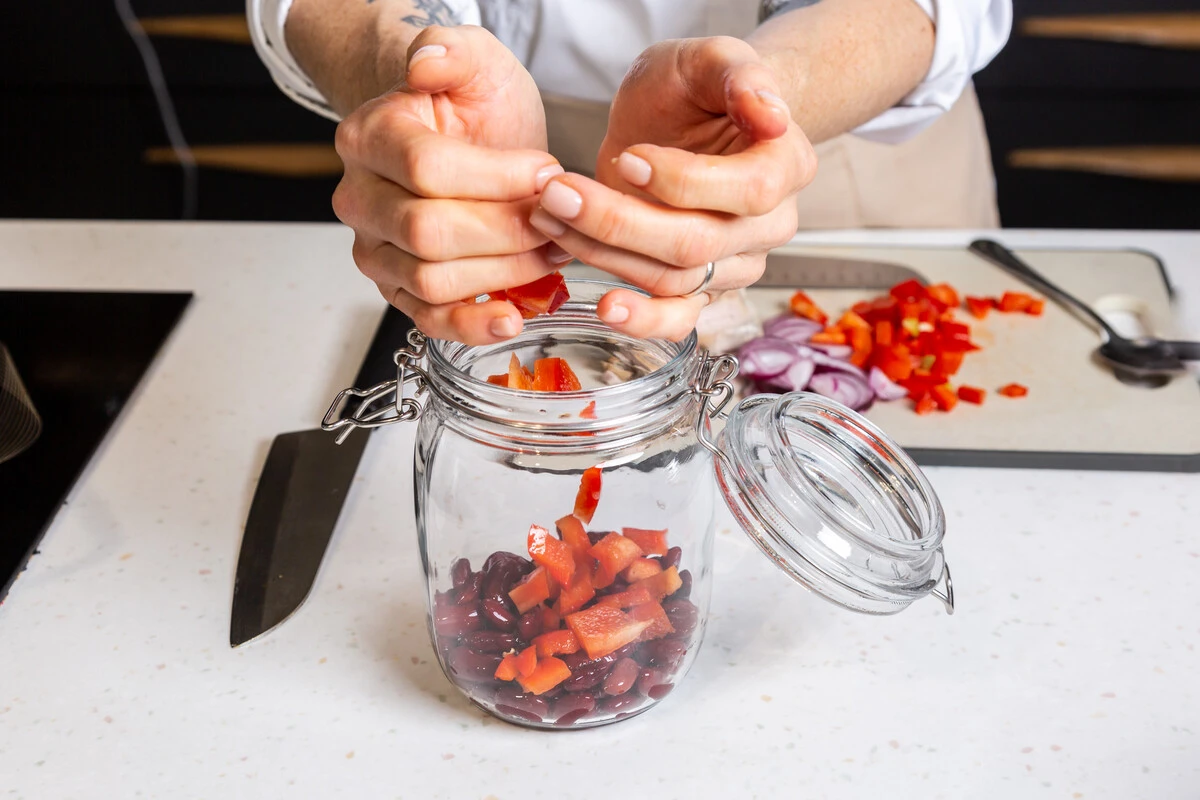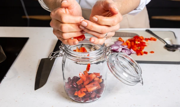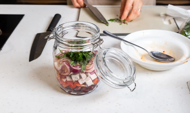 Если соединить буженину, красную фасоль, брынзу, кинзу, сладкий перец, шпинат и лук и всё это приправить сладким соусом чили — получается очень вкусный салат. Показываем, как сделать его порционно в баночке — а вы можете приготовить и в маленьком салатнике.