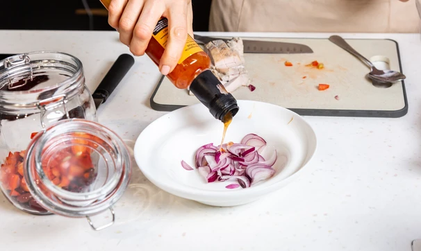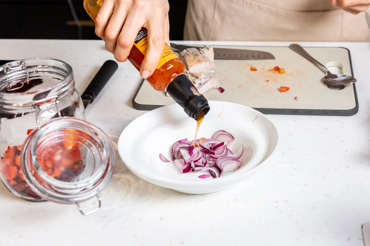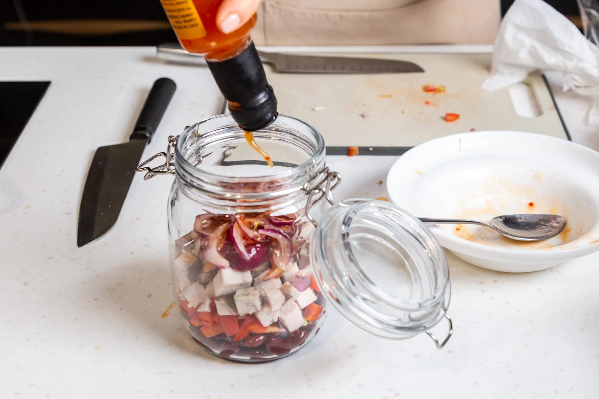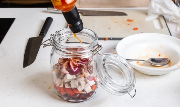 Выложите в банку поверх перца индейку, затем — лук. Добавьте ещё соуса по вкусу.
