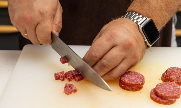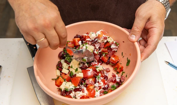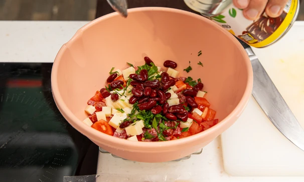 Это простое блюдо собирается за 10 минут, но по насыщенному вкусу и интересному сочетанию ингредиентов не уступает другим популярным салатам с майонезом. Пикантная колбаса, сытная фасоль и хрустящие овощи — беспроигрышный рецепт для любого застолья.
