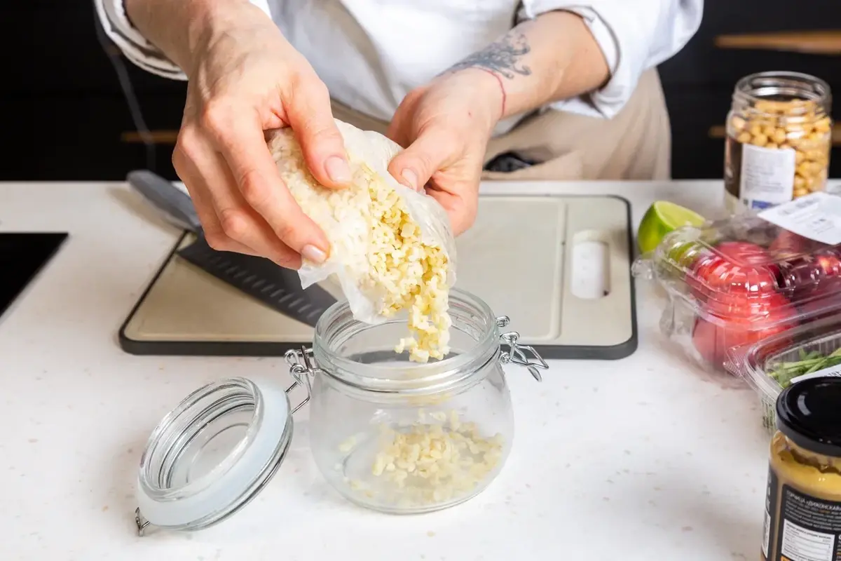 Булгур отварите согласно инструкции на упаковке. Разделите крупу и другие ингредиенты в последующих шагах на 2 равные части. Выложите булгур в банки.
