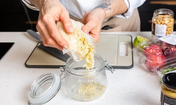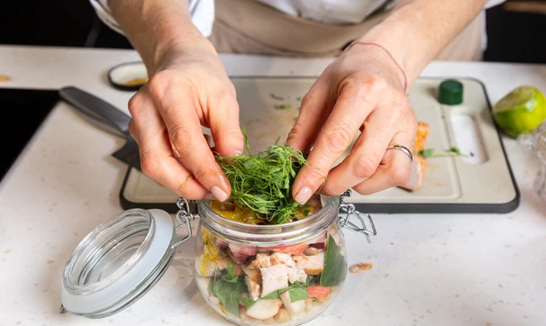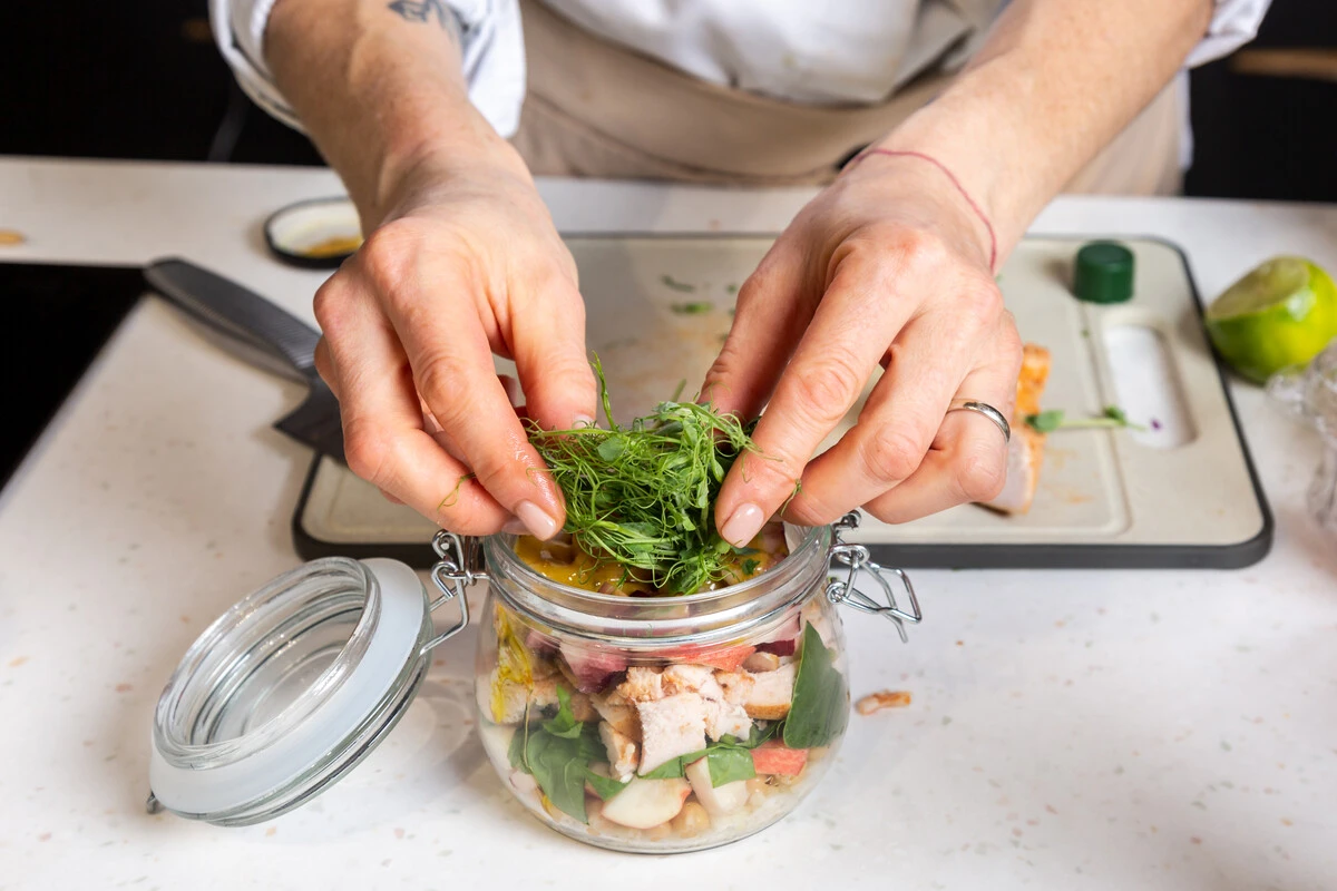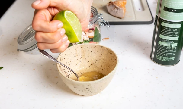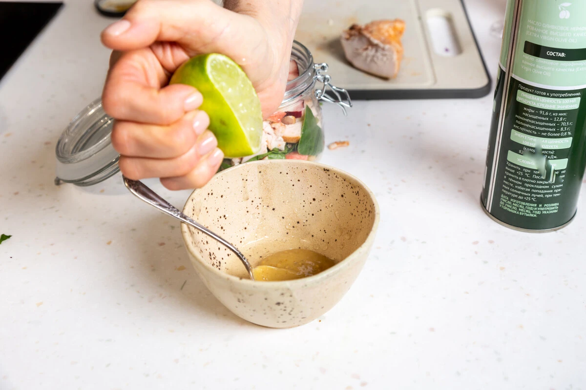 Смешайте горчицу, оливковое масло и сок лайма до однородности. Добавьте в каждую банку.