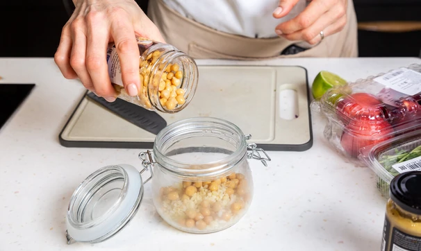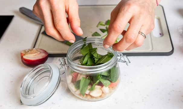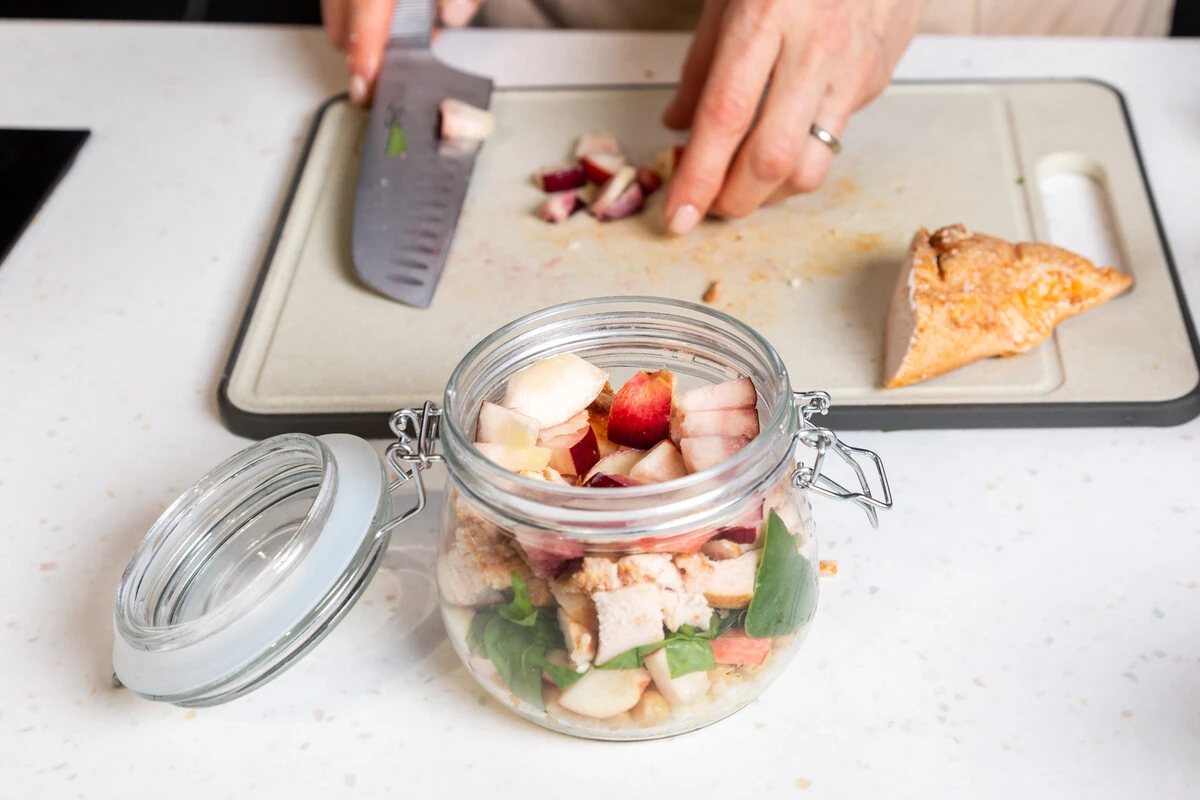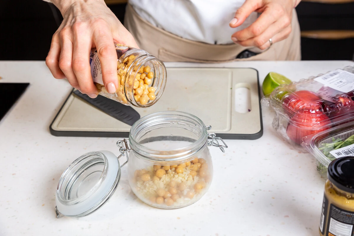 Нектарины нарежьте кубиками, добавьте половину в банку поверх нута. Помимо нектаринов можете также взять персики или инжир.