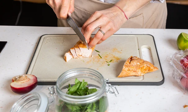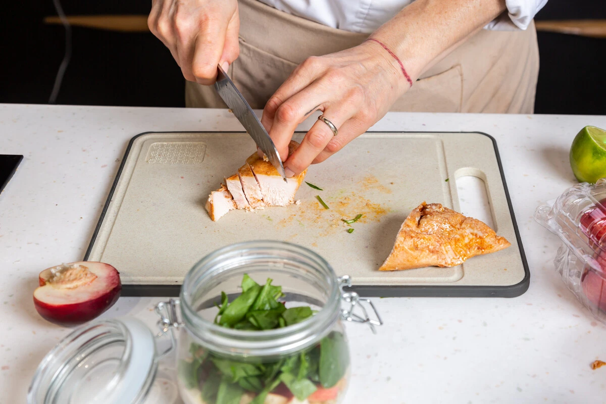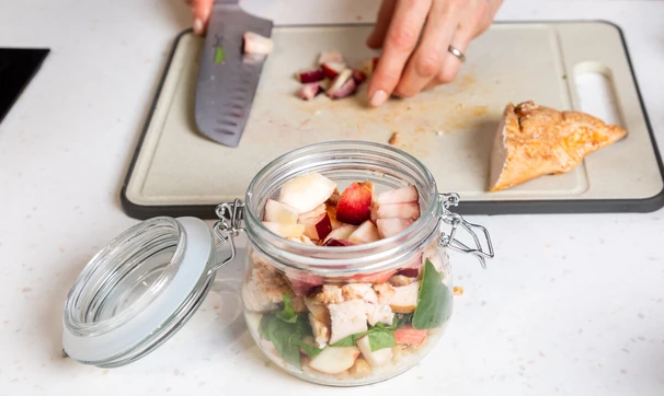 Отличный вариант обеда с собой — салат с копчёно-запечённым куриным филе, булгуром и нутом в банке. Мы также добавили нектарин и заправку из горчицы, оливкового масла и сока лайма, чтобы вкус салата стал ещё оригинальнее и ярче. Берите на заметку!