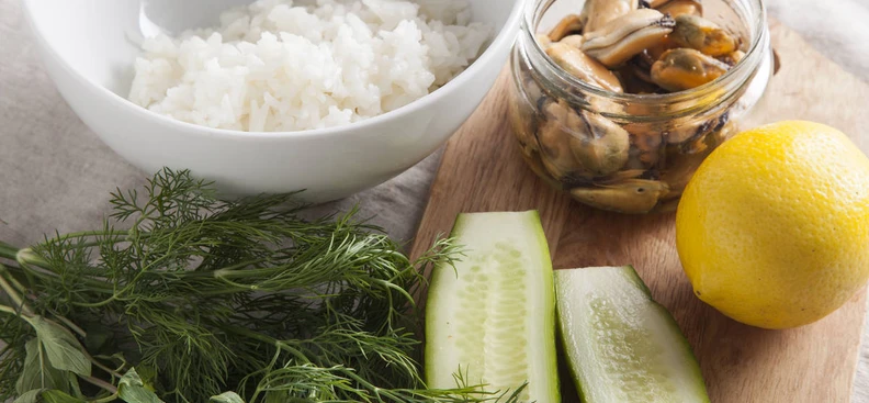 Огурец порежьте кубиками. Слейте масло с мидий, соедините их с рисом, добавьте порубленную зелень, огурец и перемешайте. Полейте салат заправкой, посолите — готово!
