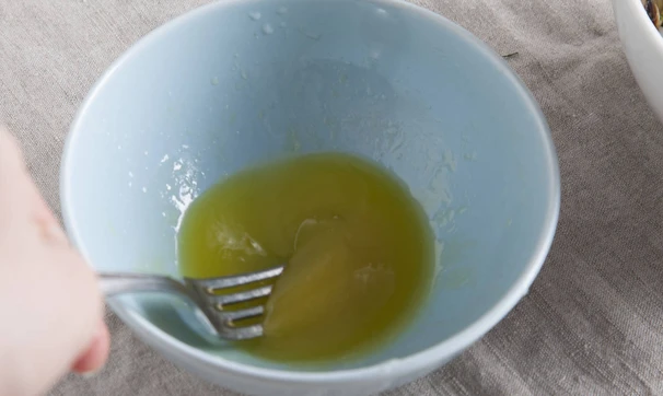 Оливковое масло смешайте с медом и лимонным соком, взбейте вилкой.
