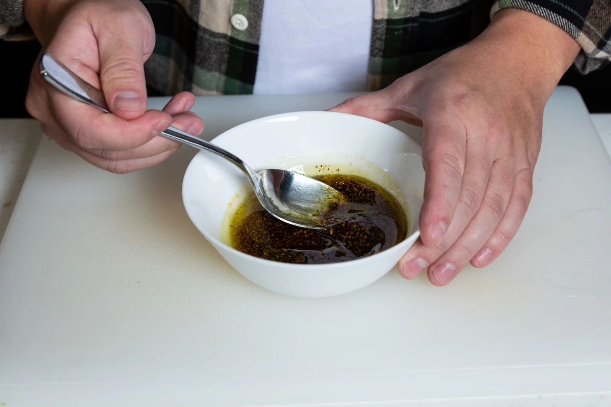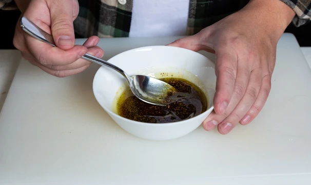 Сделайте заправку. Для этого налейте в мисочку оливковое масло, добавьте горчицу, чёрный молотый перец, соевый соус, соль, сушёный чеснок и перемешайте до соединения компонентов.