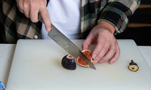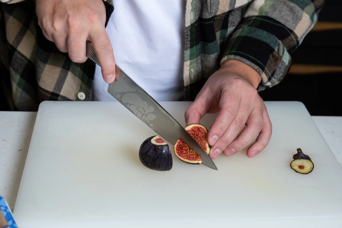 Инжир помойте, срежьте хвостики и нарежьте дольками.