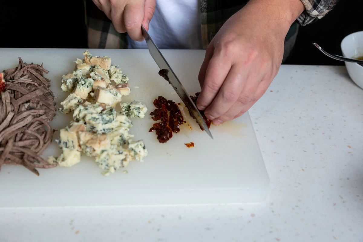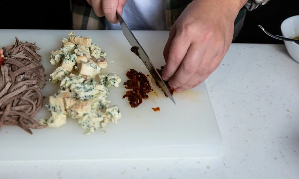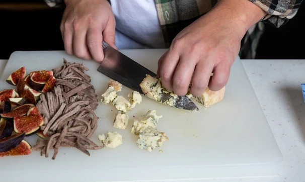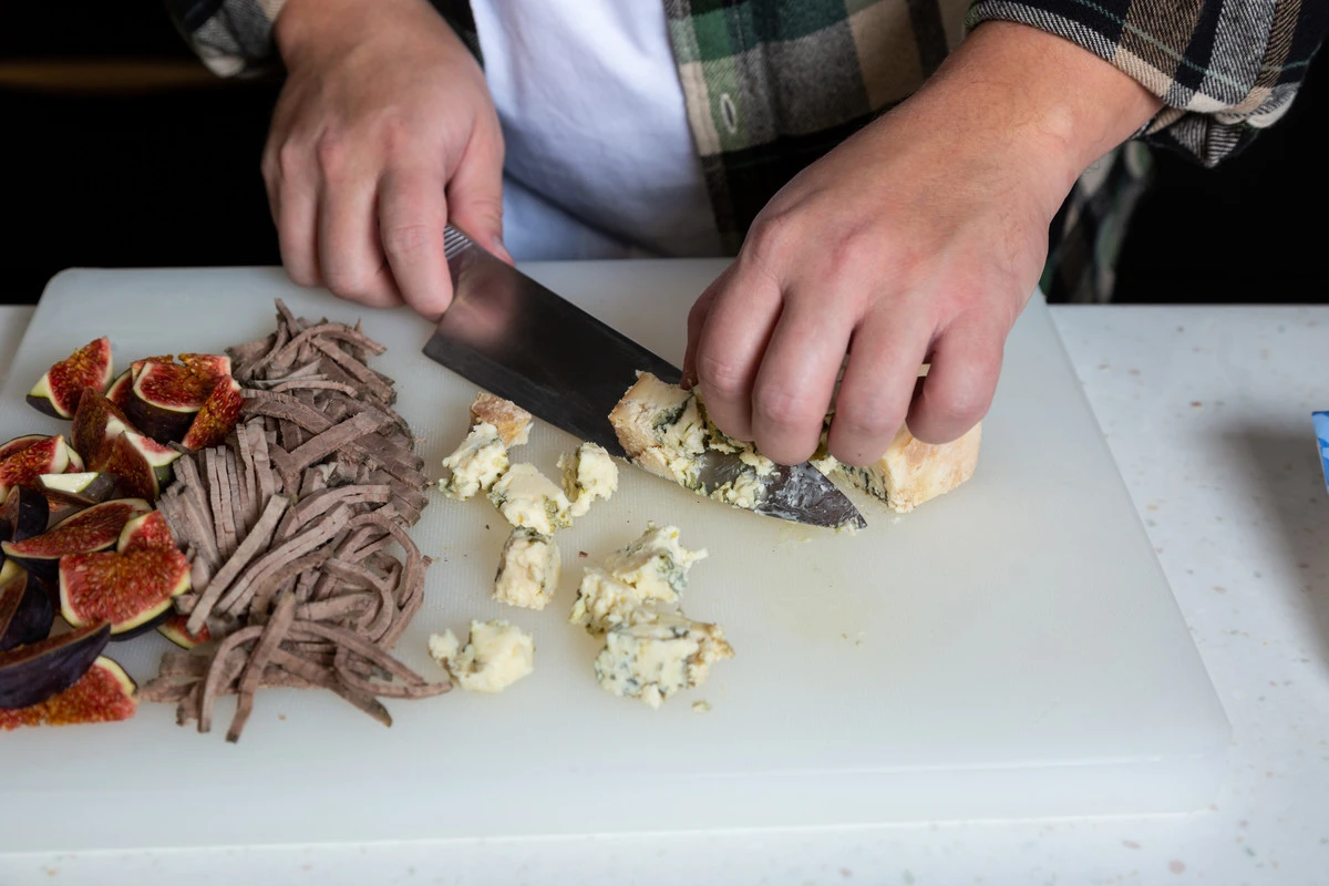 Сыр с голубой плесенью нарежьте кубиками.