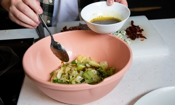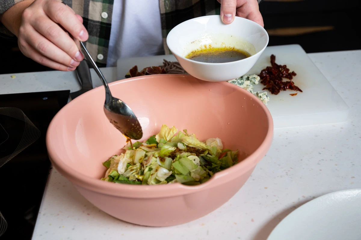 Смешайте салатный микс с подготовленной заправкой. Немного заправки оставьте для подачи.