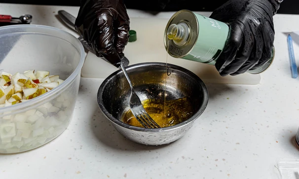 Из половины апельсина выжмите сок, смешайте с оливковым маслом, солью и перцем, взбейте вилкой.