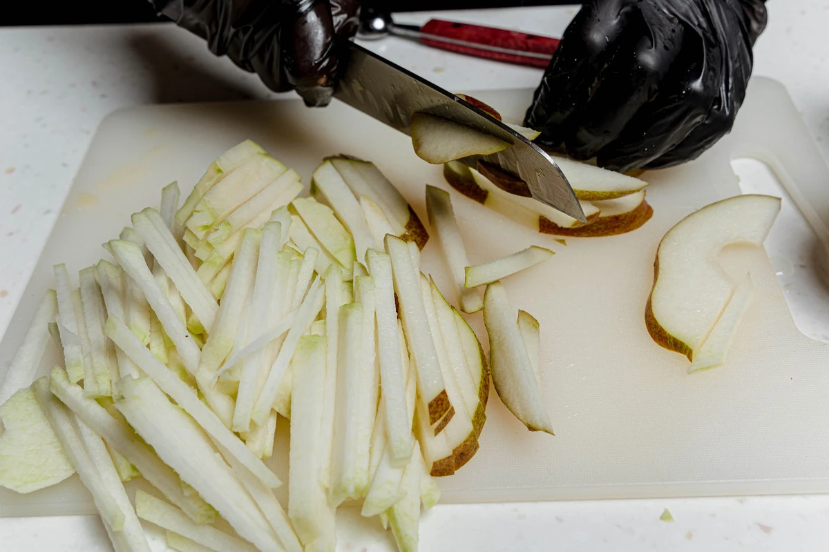 Кольраби и грушу нарежьте тонкой соломкой, сбрызните апельсиновым соком и перемешайте.