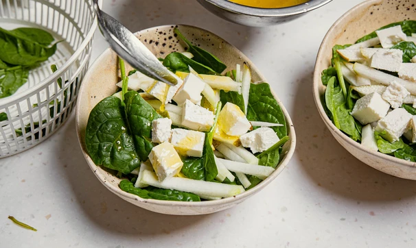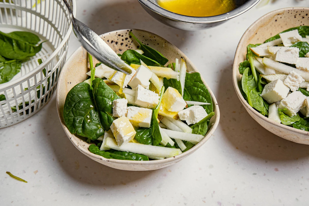 В салатник или порционные тарелки выложите шпинат, сверху соломку из кольраби и груши.