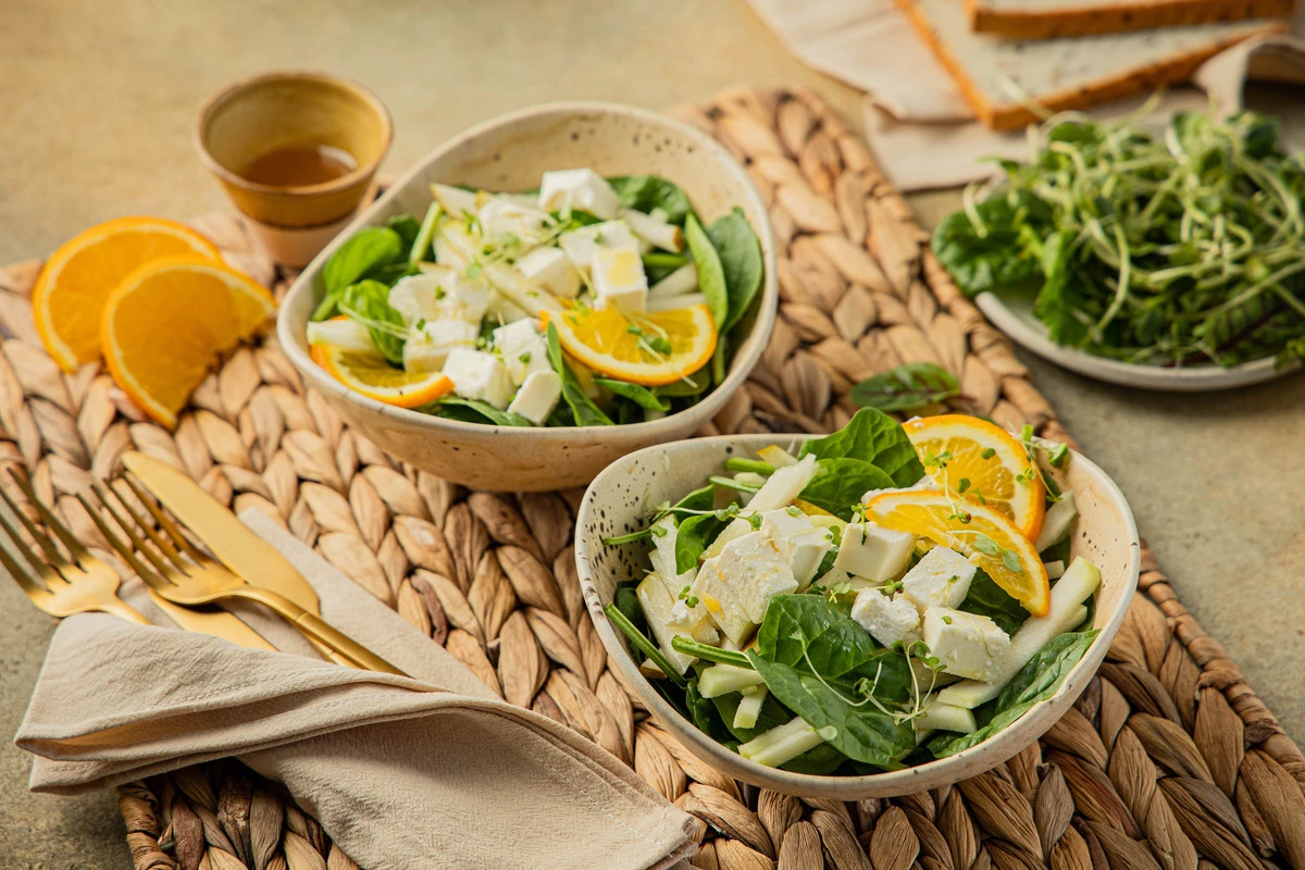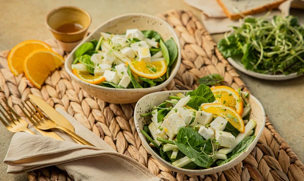 Хрустящая сочная капуста кольраби, тонкий вкус груши, нежная фета и яркая апельсиновая заправка — а в результате получается очень простой салат.