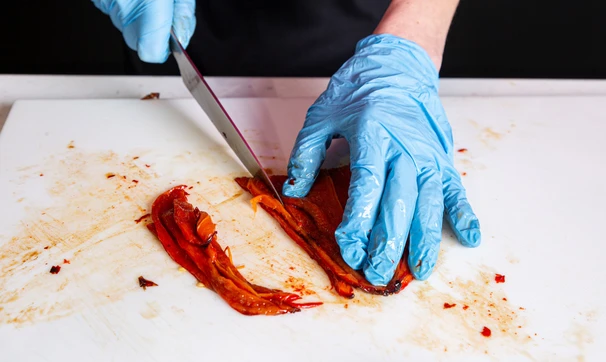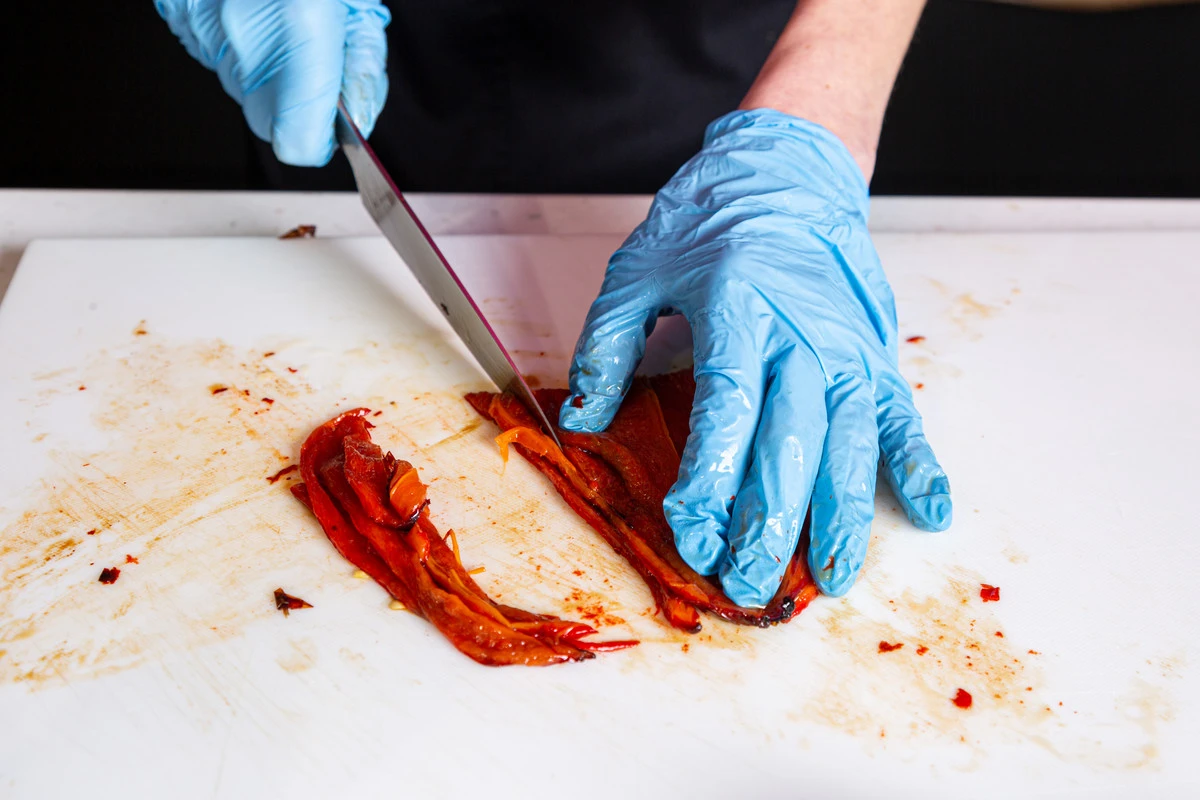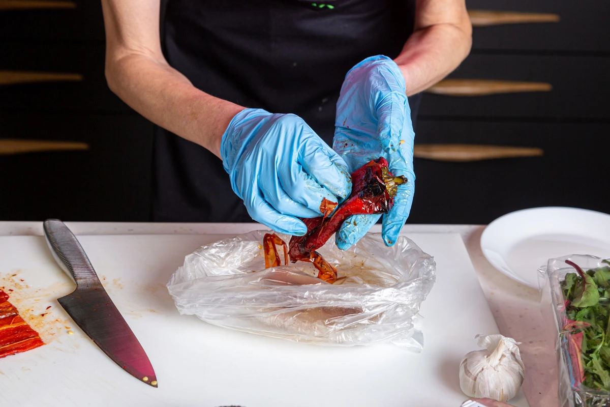 Запеките перец в духовке 15–20 минут при температуре 200 °C. Охладите и очистите мякоть.