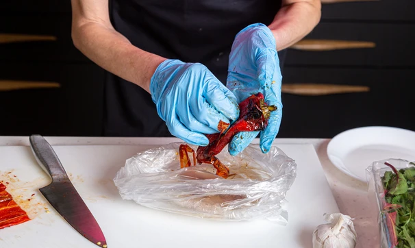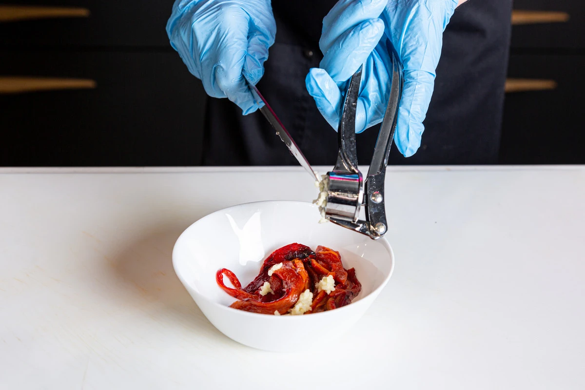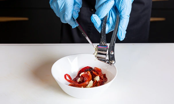 Замаринуйте перец с чесноком, растительным маслом, солью и перцем.
