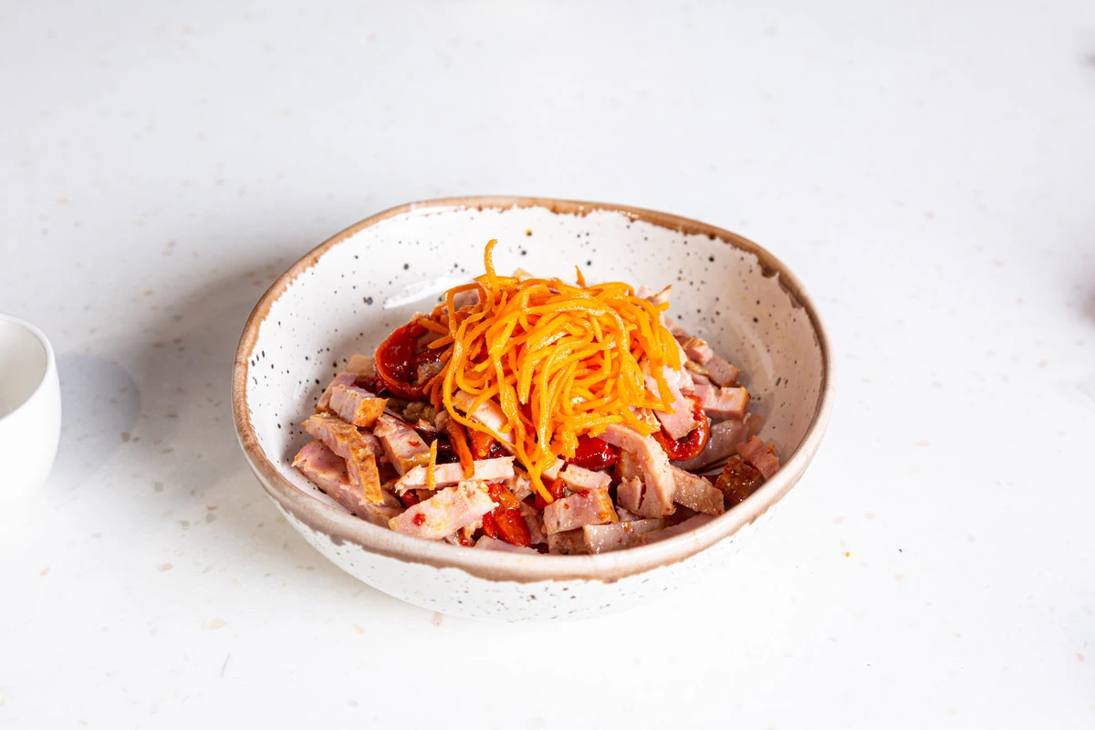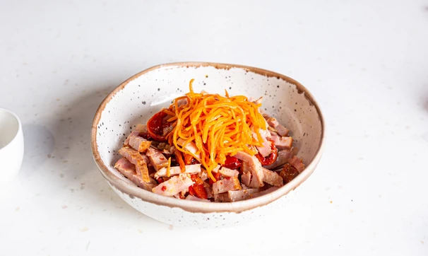 Деликатный цыплёнок оказывается здесь в яркой компании маринованного с чесноком перца рамиро и корейской моркови. Птицу по желанию можно поменять на варёный говяжий язык.