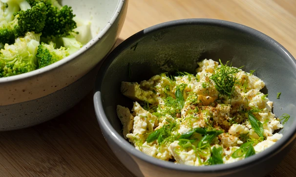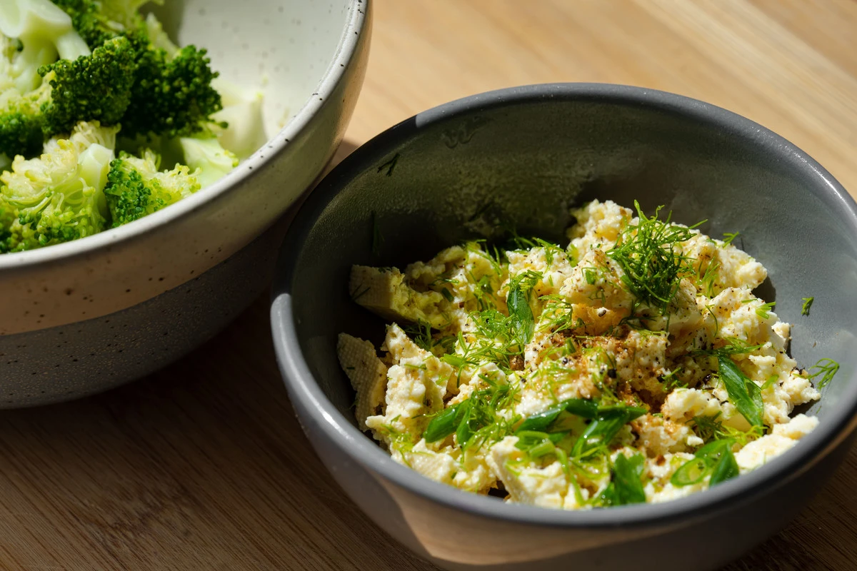 Тофу разомните вилкой, приправьте солью, чёрным перцем, оливковым маслом и соком лимона. Добавьте мелко нарезанные укроп и зелёный лук. Перемешайте и оставьте на 10 минут.