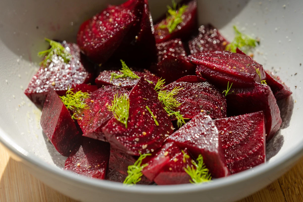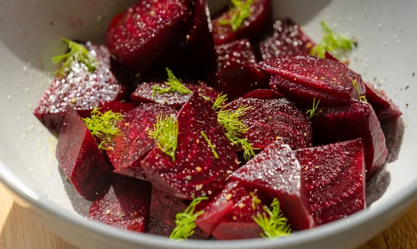 Свёклу нарежьте дольками, приправьте оливковым маслом, укропом, солью и соком лимона. Оставьте на 10 минут.