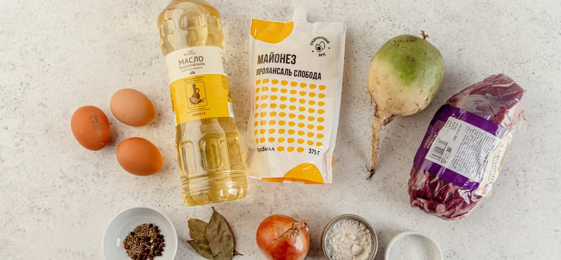 Соберите салат: выложите мясо, посолите и посыпьте зирой, сверху выложите редьку и яйца, добавьте немного майонеза.