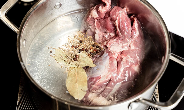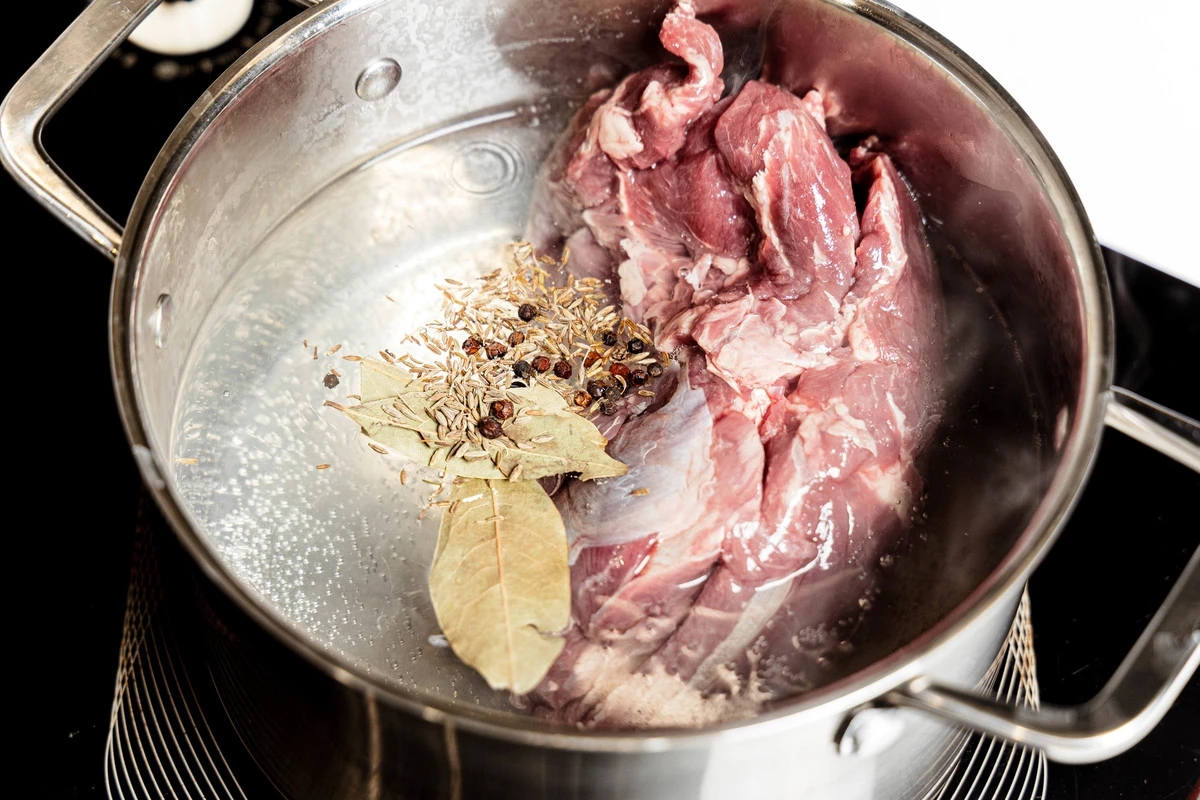 Баранину отварите до готовности, добавив в воду чёрный перец горошком и лавровый лист. Мясо выньте и остудите. Бульон можно использовать как основу для супа. Кстати, мясо можно не отваривать, а запечь в рукаве в духовке, тогда вкус получится более ярким.