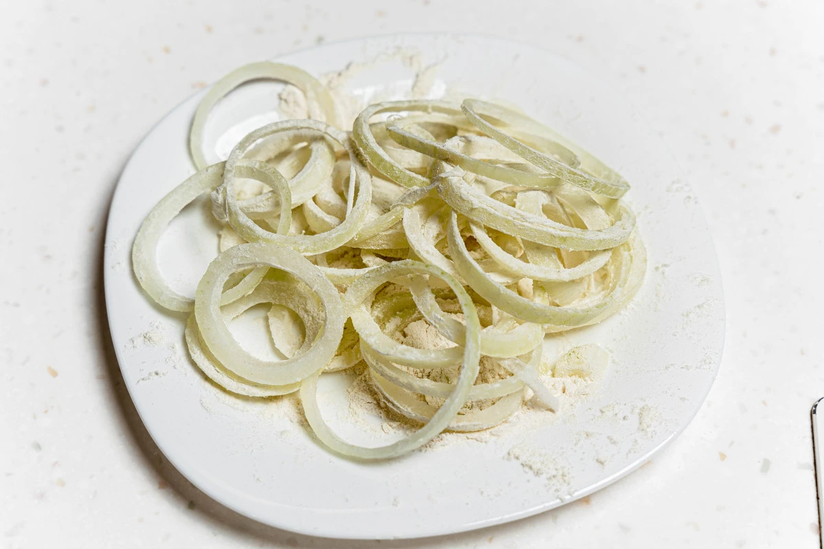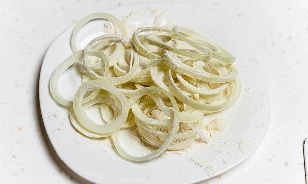 Лук нарежьте кольцами, обваляйте в муке.