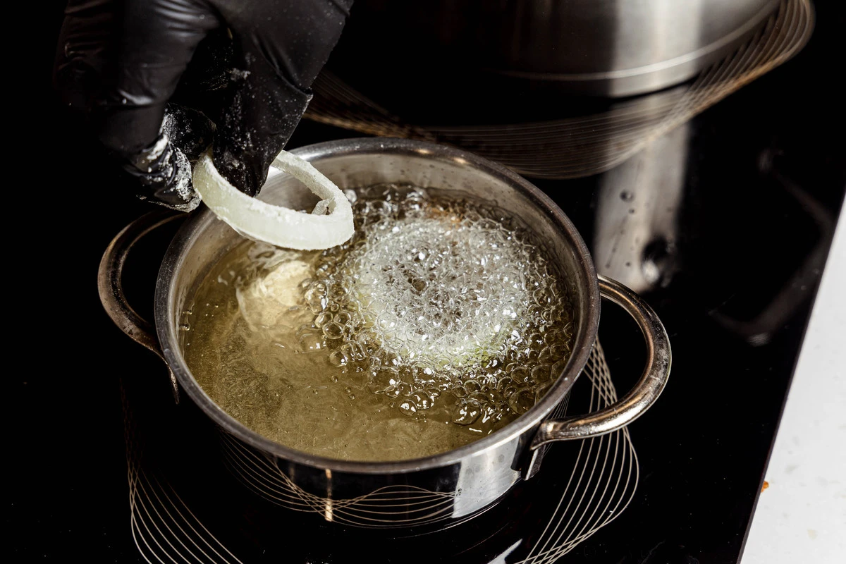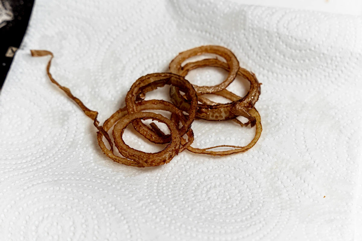 Готовые луковые кольца выложите на салфетки, чтобы убрать лишнее масло.