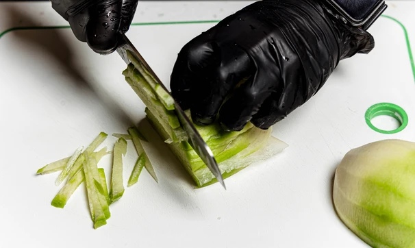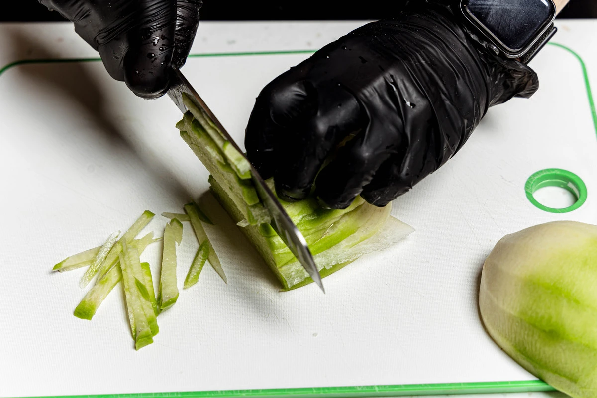 Редьку очистите от кожуры и нарежьте тонкими брусочками.