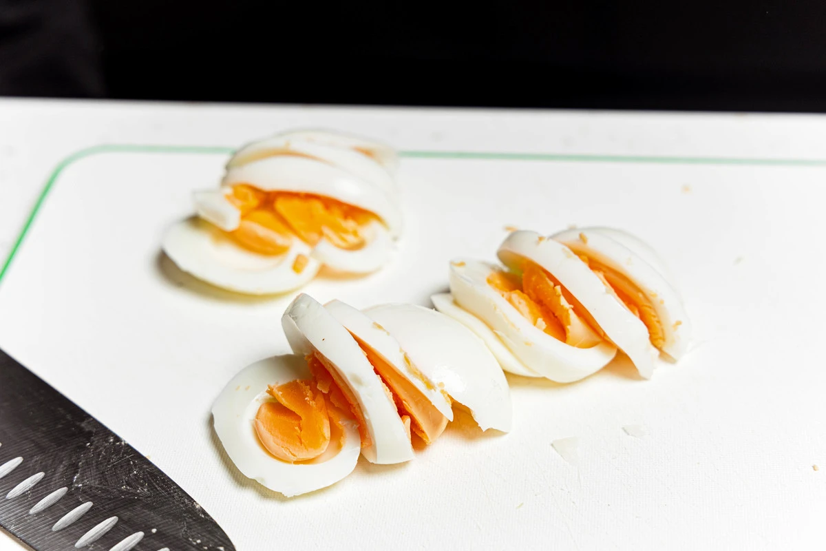 Яйца сварите вкрутую, остудите и очистите от скорлупы. Нарежьте кружочками.