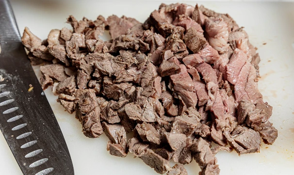 Отваренное мясо нарежьте кубиками или тонкими пластинками.