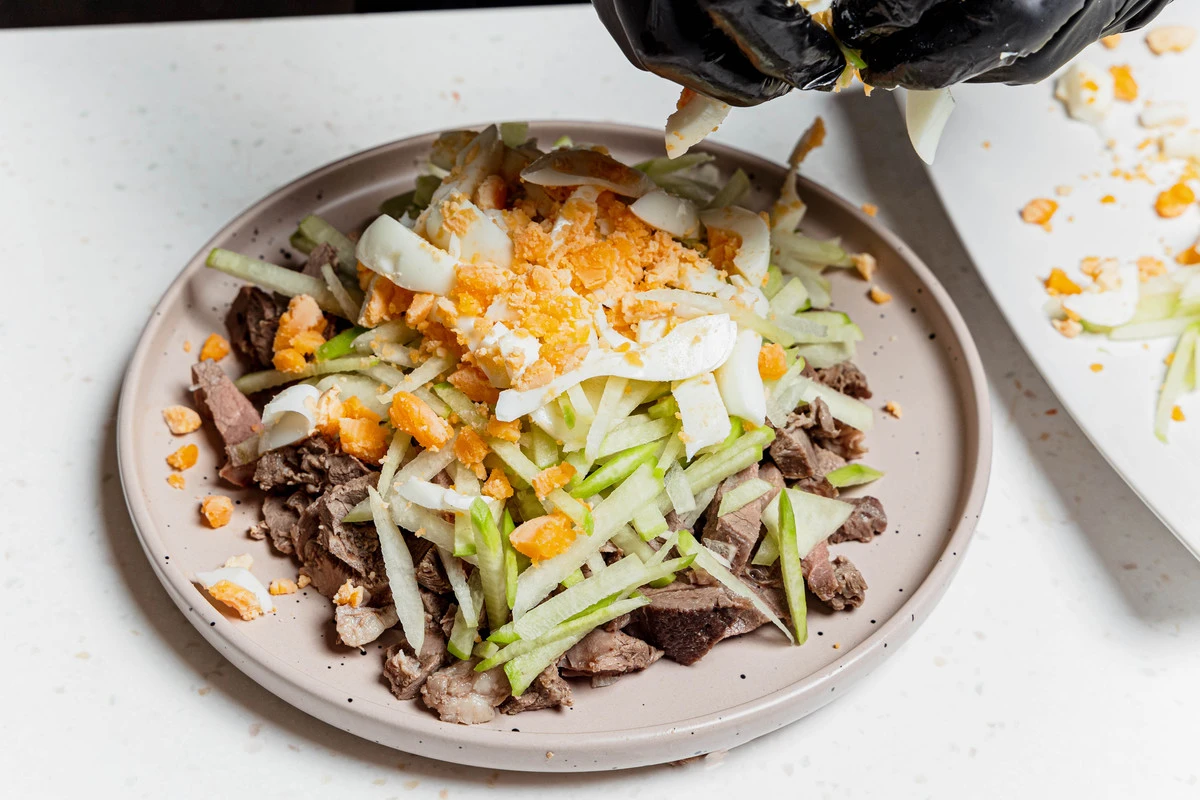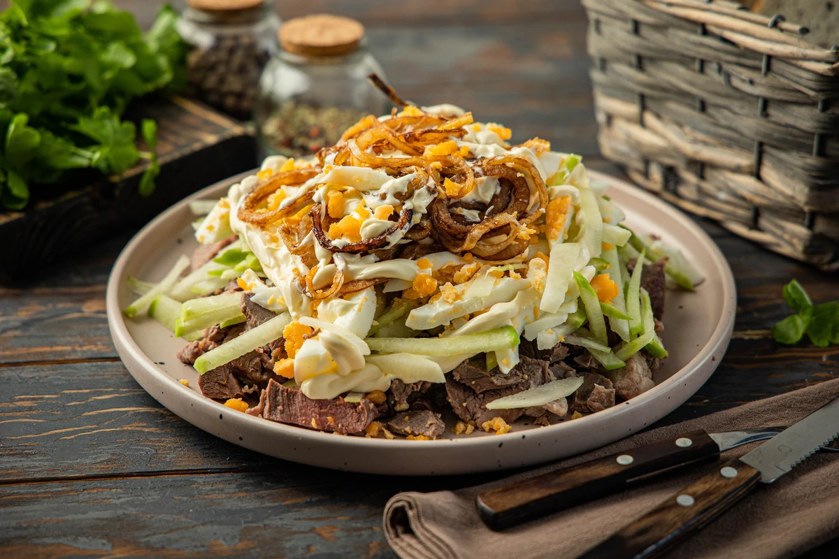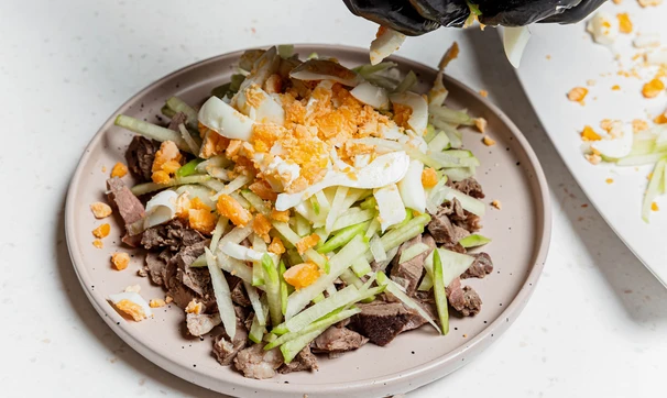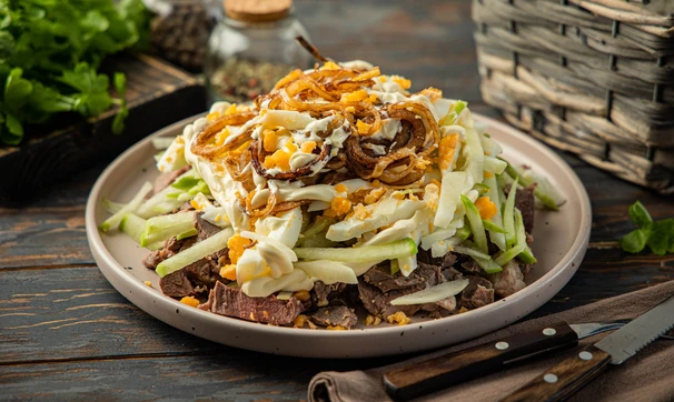 Салат «Ташкент», конечно же, никакое не узбекское блюдо, а стилизация, этакий оливье в среднеазиатском стиле. Мы попробовали приготовить знаменитый салат с бараниной, чтобы добавить ещё больше «узбекских ноток», но классический вариант всё-таки с говядиной, поэтому сами выбирайте, что вам больше нравится. А вот зелёная редька и жареный во фритюре лук — это обязательные составляющие того самого вкуса.