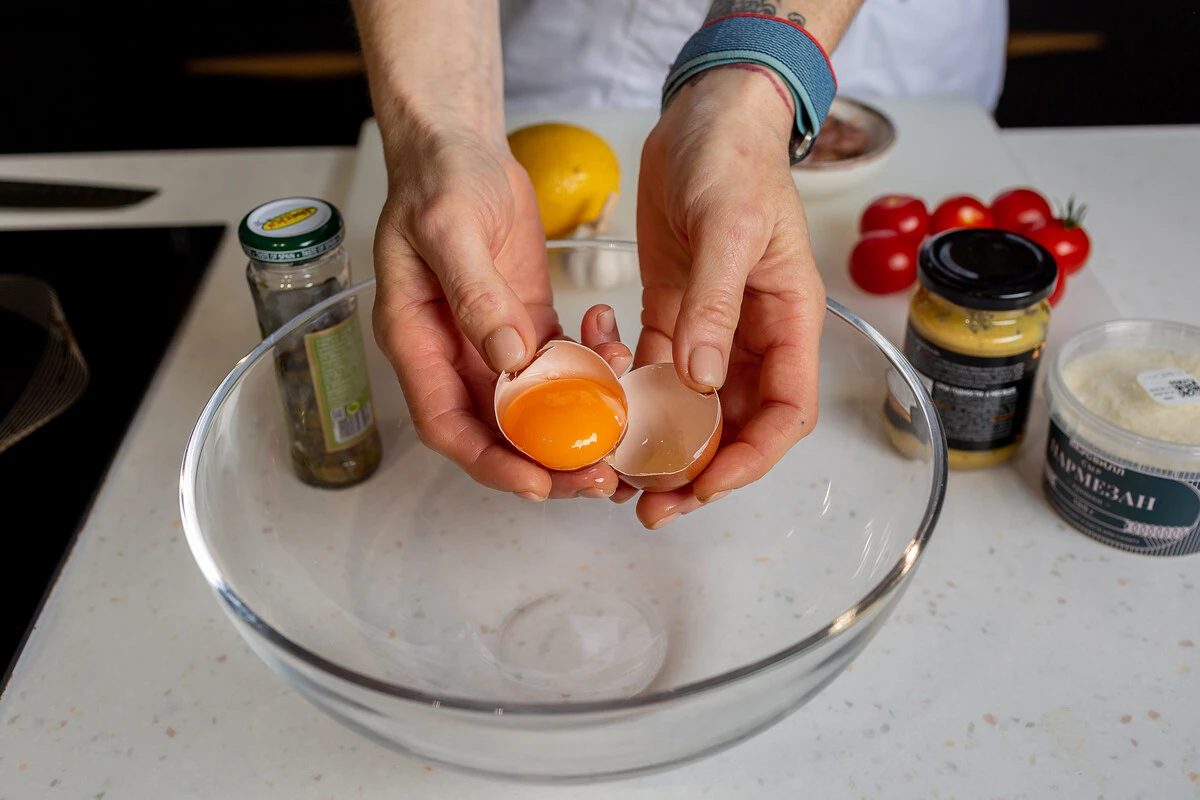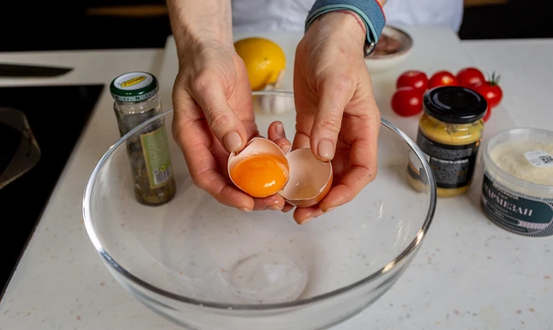 Отделите желтки от белков. В рецепте «Цезаря» вам понадобятся только желтки, а белки можно использовать для приготовления, например, белкового омлета, безе, меренгового рулета. Желтки положите в миску.