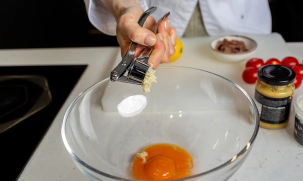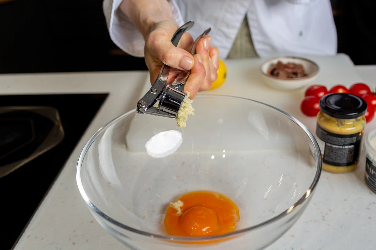 Чеснок почистите и пропустите через пресс, добавьте к желткам. Влейте лимонный сок и разотрите всё вместе вилкой.