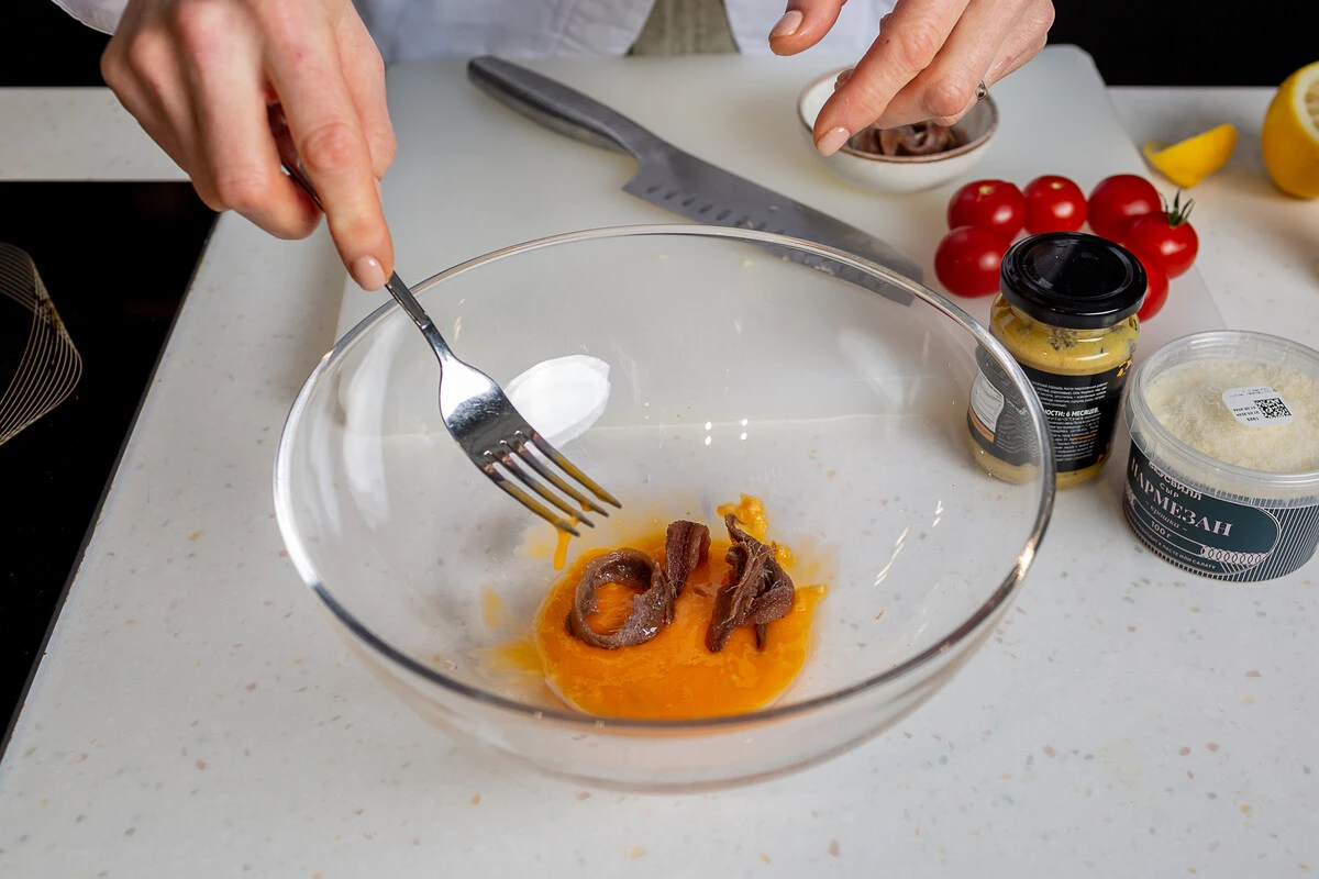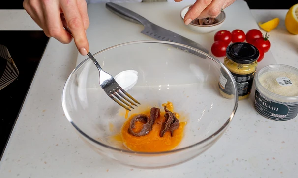 Добавьте 3-4 анчоуса и снова разотрите вилкой.