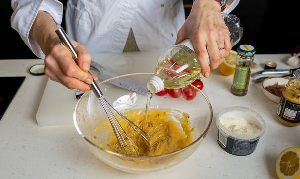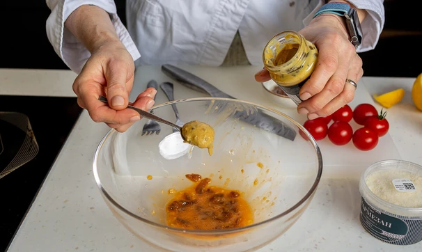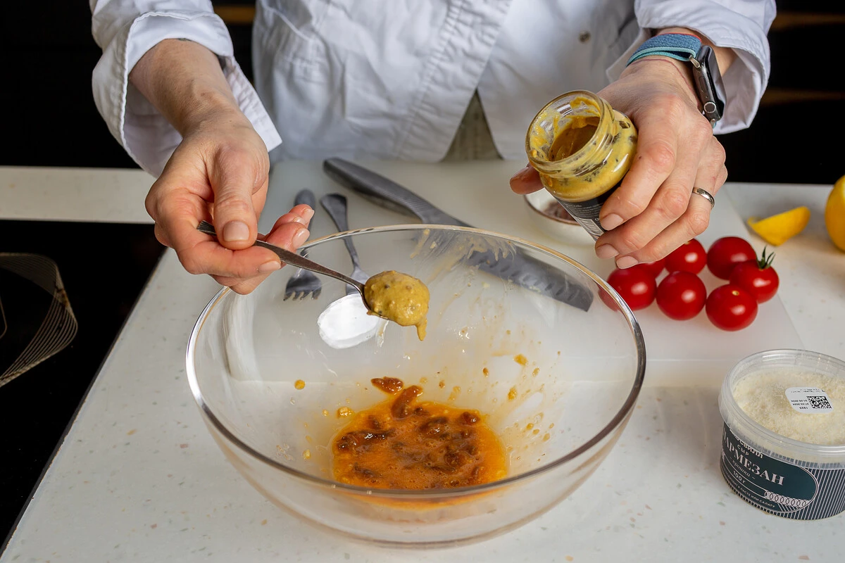 Положите дижонскую горчицу и, продолжая растирать будущую заправку вилкой, вливайте по чуть-чуть оливковое масло. Добавьте 1 ст. л. тёртого пармезана и снова перетрите всё вилкой.