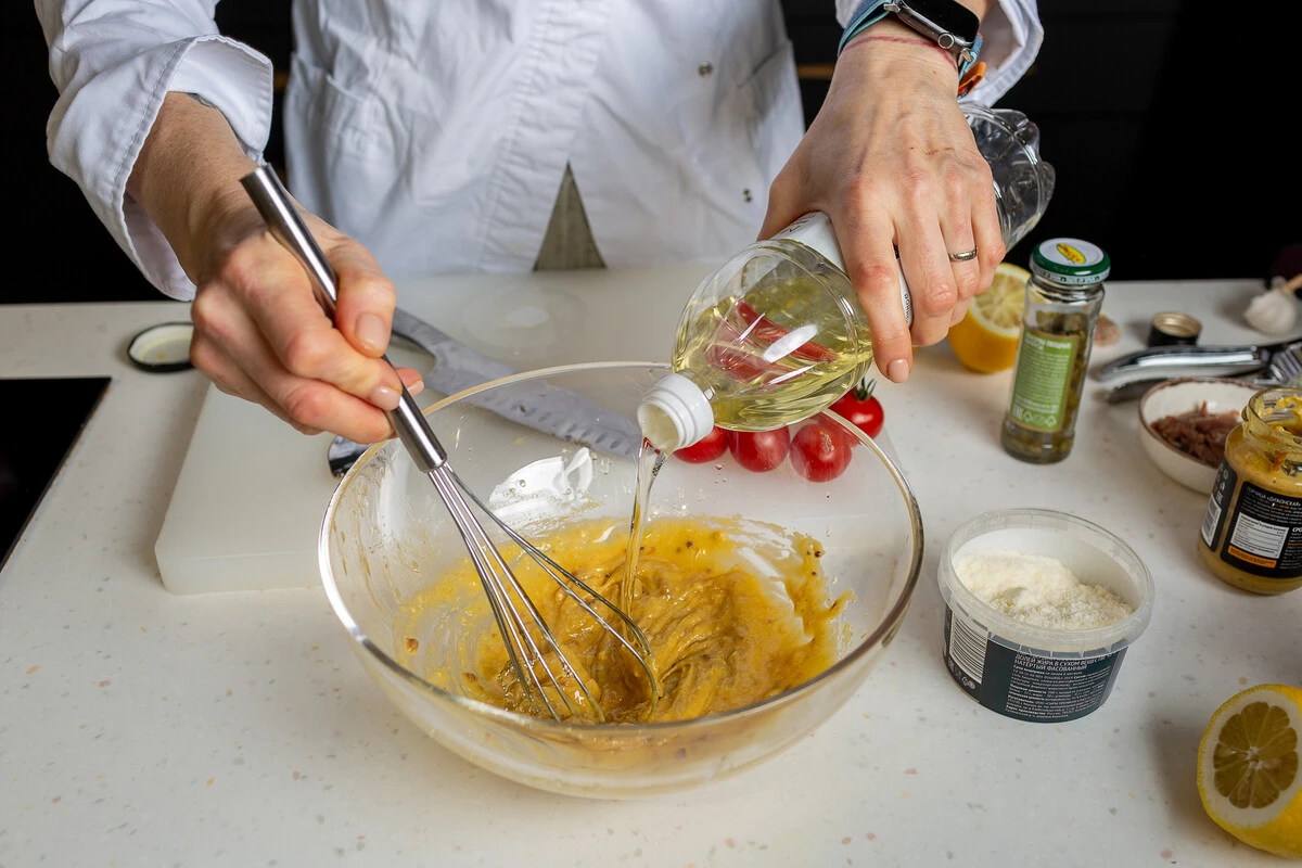 Добавьте растительное масло и каперсы, соединяя ингредиенты венчиком. Добавьте сахарную пудру и перемешайте до однородности.