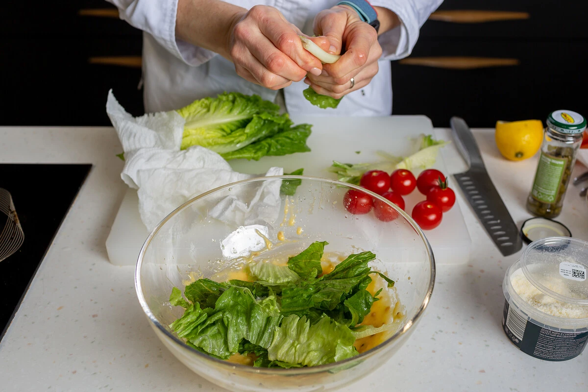 Листья салата романо помойте и обсушите. Порвите на кусочки и смешайте с соусом.