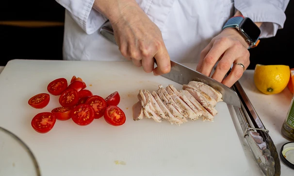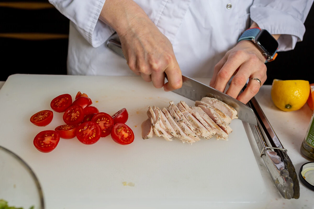 Помидоры черри разрежьте на половинки. Куриную грудку нарежьте ломтиками.