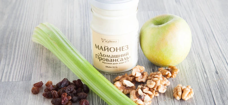 Смешайте сельдерей, яблоко, изюм и половину орехов, посолите, поперчите и заправьте майонезом, перемешайте. Готовый салат посыпьте оставшимися орехами — подавайте!