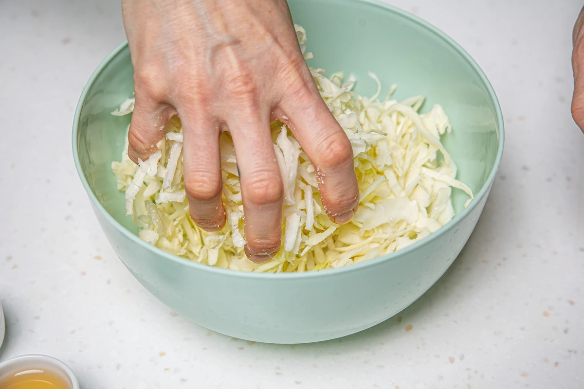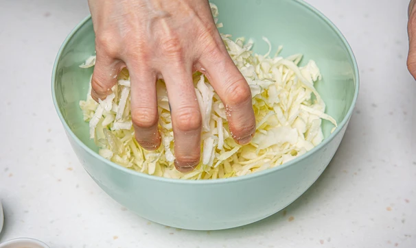 Капусту тонко нашинкуйте или используйте готовую нарезанную. Добавьте к капусте соль и сахар и разомните руками, чтобы капуста дала сок.