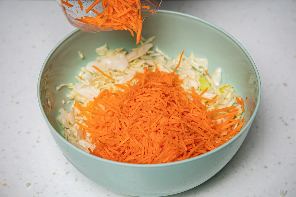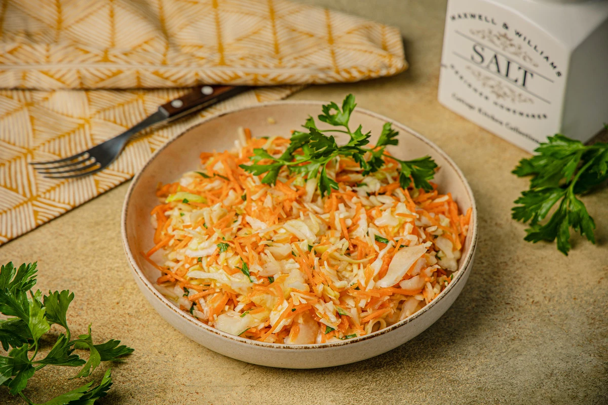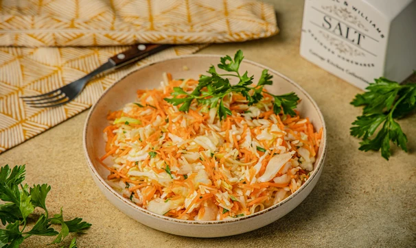 Этот салат очень удобно готовить из уже нашинкованных капусты и моркови из ВкусВилла, тогда всё приготовление занимает не более 10 минут. Витаминный салат по желанию можно заправить майонезом или сметаной, но всё-таки самый классический вариант — с заправкой «винегрет» на основе винного уксуса и оливкового масла. Вместо винного уксуса можно также использовать сок лимона, а ещё попробовать заменить оливковое масло на ароматное подсолнечное.