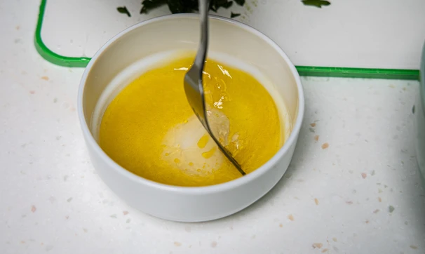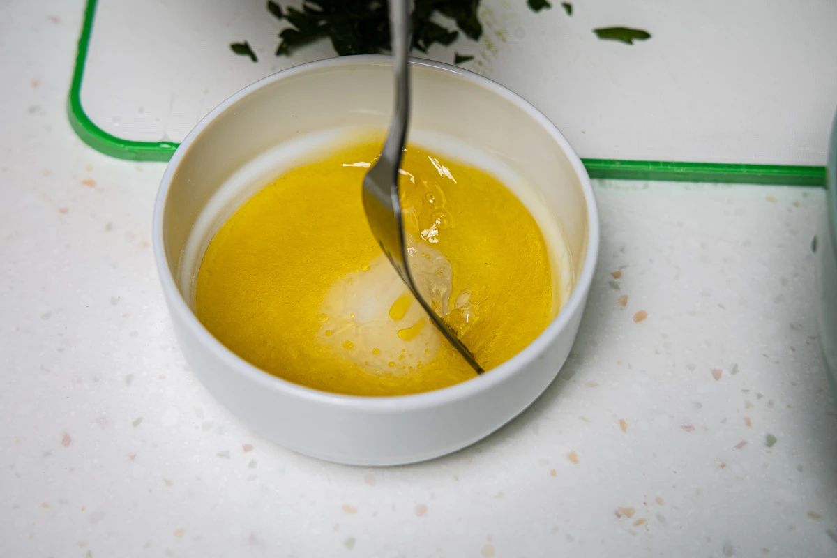 Смешайте уксус с маслом и слегка взбейте вилкой.