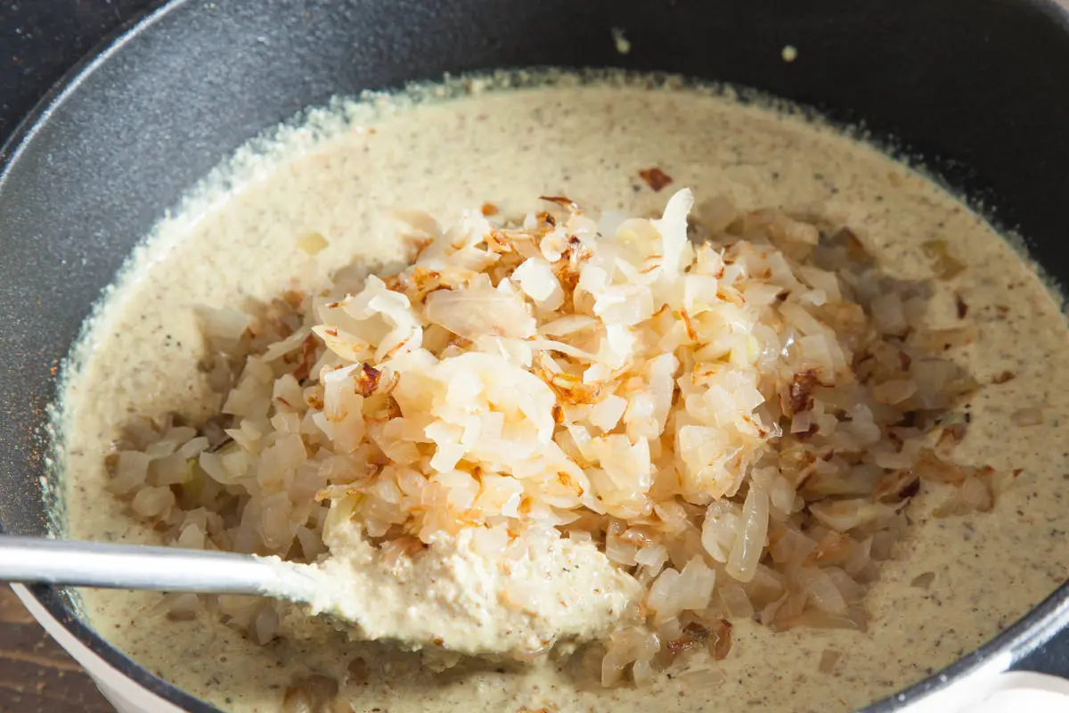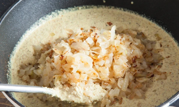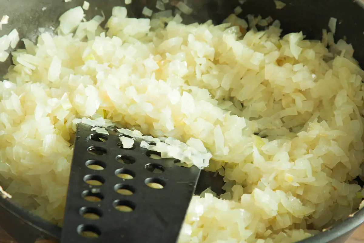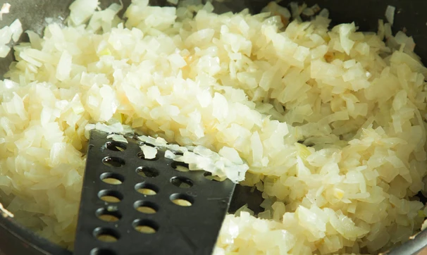 Лук нарежьте мелко и обжарьте на жире, снятом с бульона, до прозрачности.