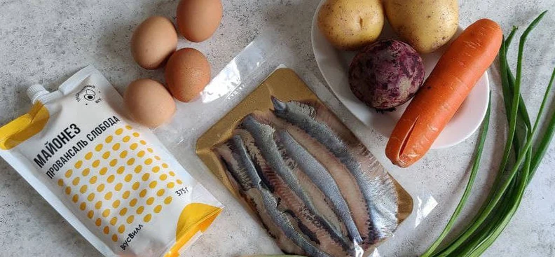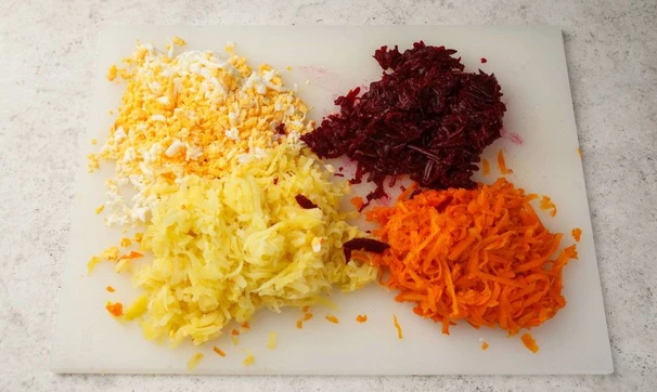 Яйца сварите вкрутую, охладите и очистите от скорлупы, натрите. Овощи очистите от кожуры и также измельчите на средней тёрке. Селёдку нарежьте небольшими кусочками.