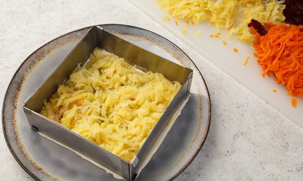 Собирайте салат слоями в глубокой форме или на плоской тарелке, установив кулинарное кольцо (предварительно смажьте растительным маслом изнутри). Первым слоем картофель.