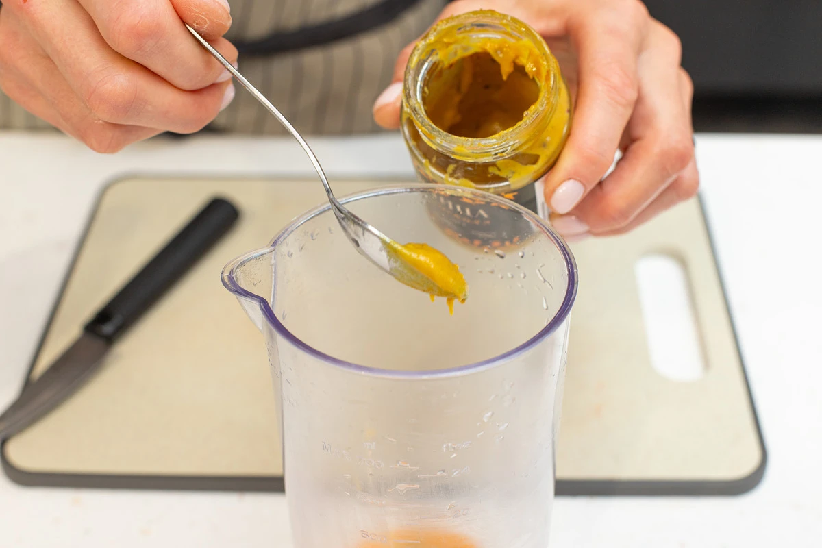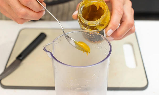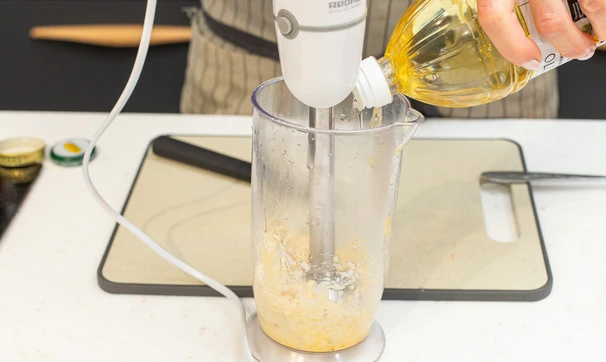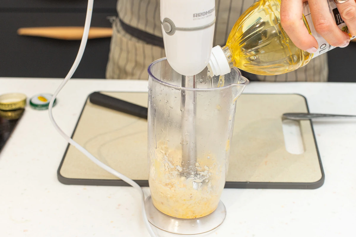 В стакан блендера положите желток, чеснок, горчицу, налейте сок лимона и 1 ч. ложку холодного растительного масла.