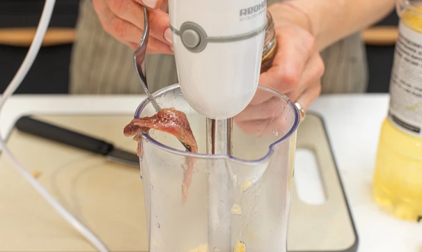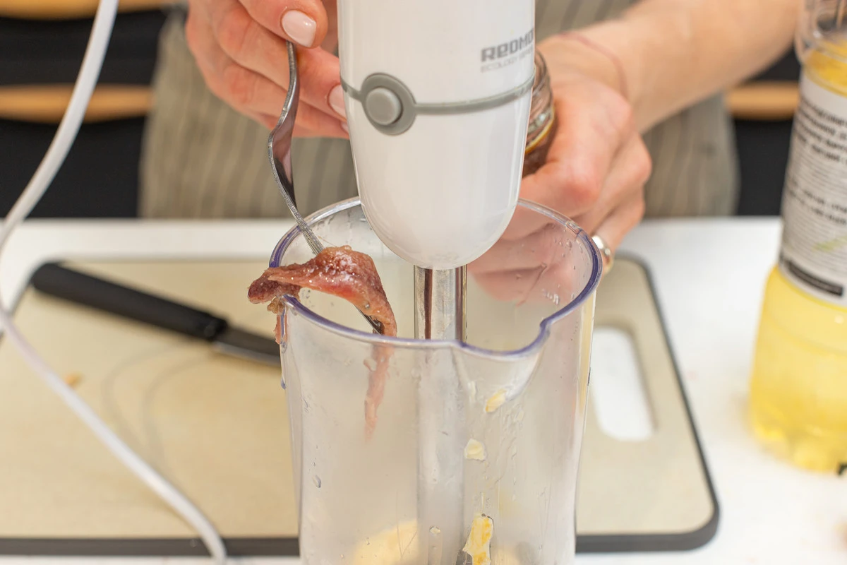 Добавьте в соус анчоусы, каперсы, сахар, 1 ч. ложку масла и взбейте. Далее продолжайте добавлять по чайной ложке масла и взбивать. Важно лить холодное масло именно по чуть-чуть, иначе соус может не получиться. Взбивайте до консистенции майонеза.